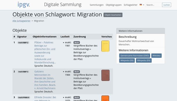 Ab 2025 ersetzt unsere Digitale Sammlung das 2022 vorgestellte Digitalen Repositorium. Auf dieser Plattform können Sie weiterhin auf die vergriffenen Bücher unseres Institutsverlages zugreifen, die nun auch durch optische Texterkennung vollständig durchsuchbar angeboten werden. Erweitert soll unsere Digitale Sammlung in Zukunft durch die Objekte unserer Institutssammlung werden, sodass Sie unsere Bestände in diesem digitalen Findbuch über https://sammlung.pfalzgeschichte.de bequem von zu Hause aus durchsuchen, Digitalisate einsehen oder ihren Rechercheaufenthalt bei uns planen können.