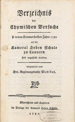 • Publizistisch ebenso rege war Friedrich Kasimir Medicus, etwa zum Thema „Nicht das Klima, sondern eine glückliche bürgerliche Regierung ist die Mutter der Wissenschaften“ (1775) und mit einem „Verzeichnis der Chymischen Versuche, so in dem Sommerhalben Jahre 1780 auf der Kameral Hohen Schule zu Lautern sind angestellt worden“ (1781).